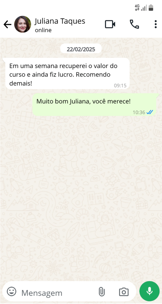Depende do seu ritmo. Alguns alunos conseguem as primeiras vendas em poucos dias, outros demoram algumas semanas. O mais importante é seguir o passo a passo, ser constante, e postar os vídeos corretamente. O método funciona, basta aplicar.